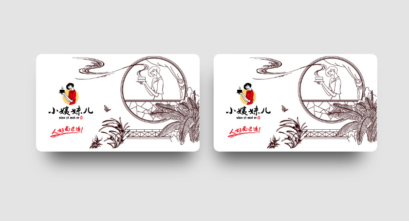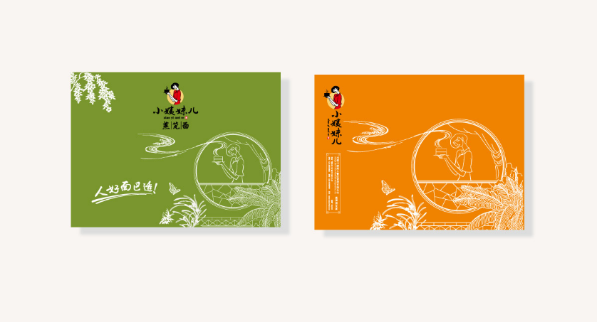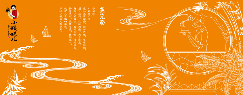 小姨妹儿,人好面巴适,宛如大家闺秀,知书达理,气质沉稳,眉目疏朗。礼貌周全,抑或小家碧玉,秀儿不媚,清而不寒,勤劳乖巧,热情可爱,体贴家人。小姨妹儿蒸笼面标志设计以清纯、朴素、温婉、勤劳的小姨妹儿人物为形象。人物容貌眉清目秀甜美可人,神情喜悦略带羞涩。体态曲线柔美玉树临风,服饰简洁贴身蕴含东方旗袍风韵,动作恰到好处奉献出盤香飘逸的蒸笼面。乌黑秀发丹红朱唇,柳叶弯眉洁白肌肤,描绘出冰清玉洁的女孩形象;使品牌注入了青春活力,洋溢着无限的生命力。标志色彩以中国大红和水墨黑为主,底衬宣纸黄,充满中国国画意境;造型现代简约,充满了现代感。