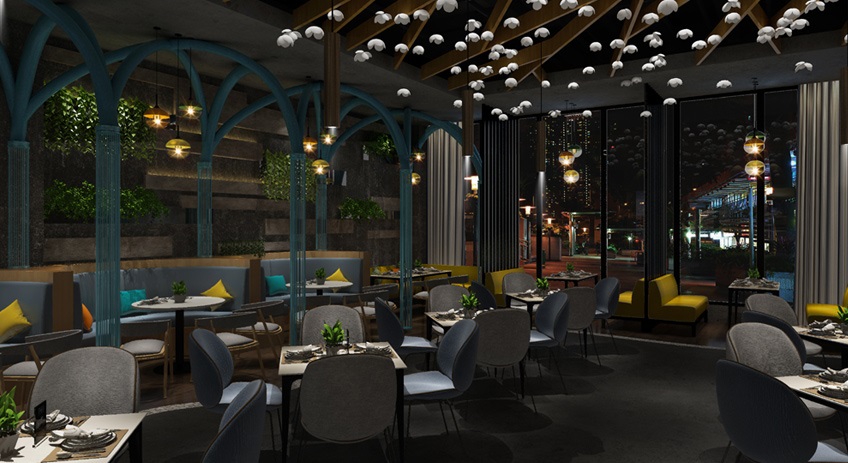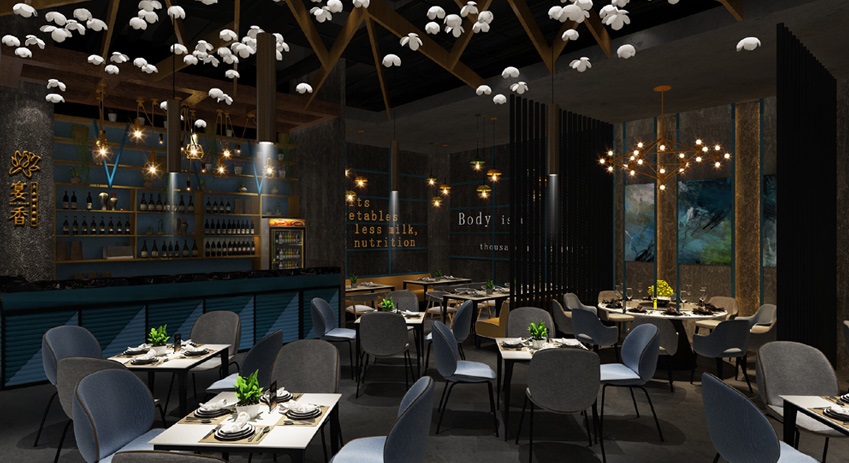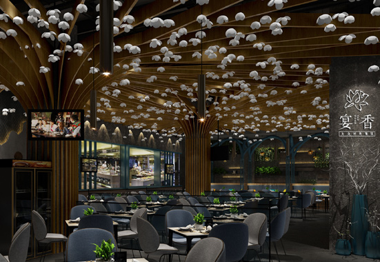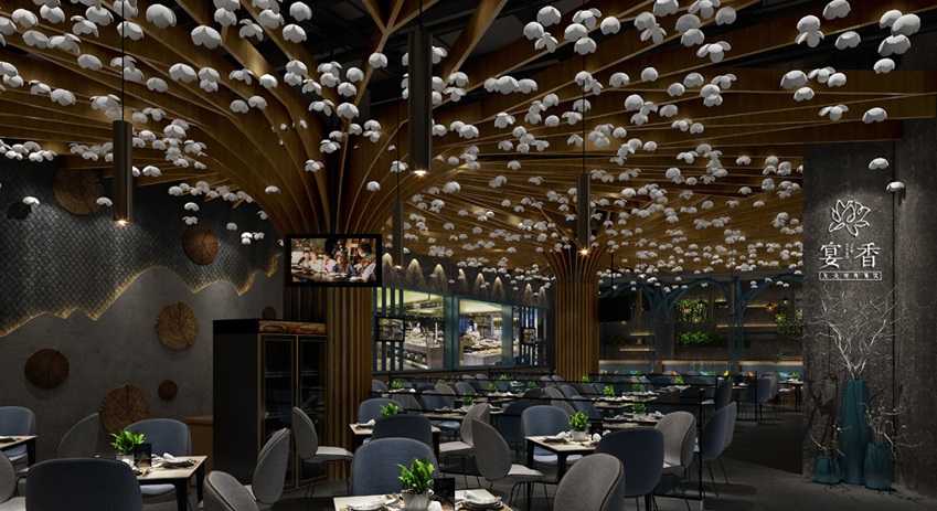 餐厅的经营理念与设计理念融合在一起的时候,产生出了这样一个舒适时尚的餐饮空间。设计灵感来源于自然的力量,挺拔蔓延的树木形状作为吊顶,配以纯白的花朵布满整个大厅区域,一个充满活力的氛围从空间中脱颖而出。在这之外的包间区域运用同样的色调延伸进入,在宏观中隔绝出了一个安静隐私的个人区域,无论是商务宴请还是休闲小憩,都是一个理想去处。
